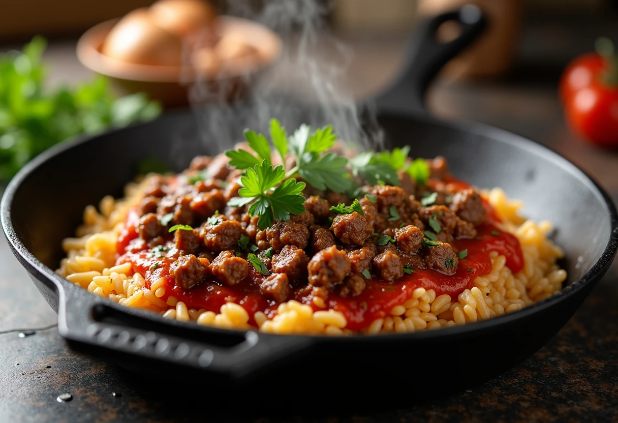 Return browned beef to the skillet and stir everything together.