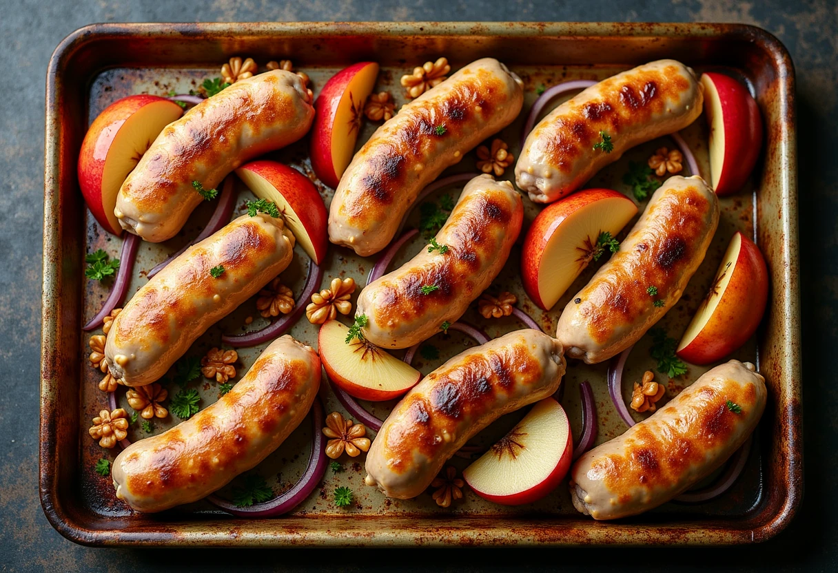 Arrange sausage rounds, apple wedges, and red onion wedges on a large baking sheet. Toss with olive oil, salt, and pepper.