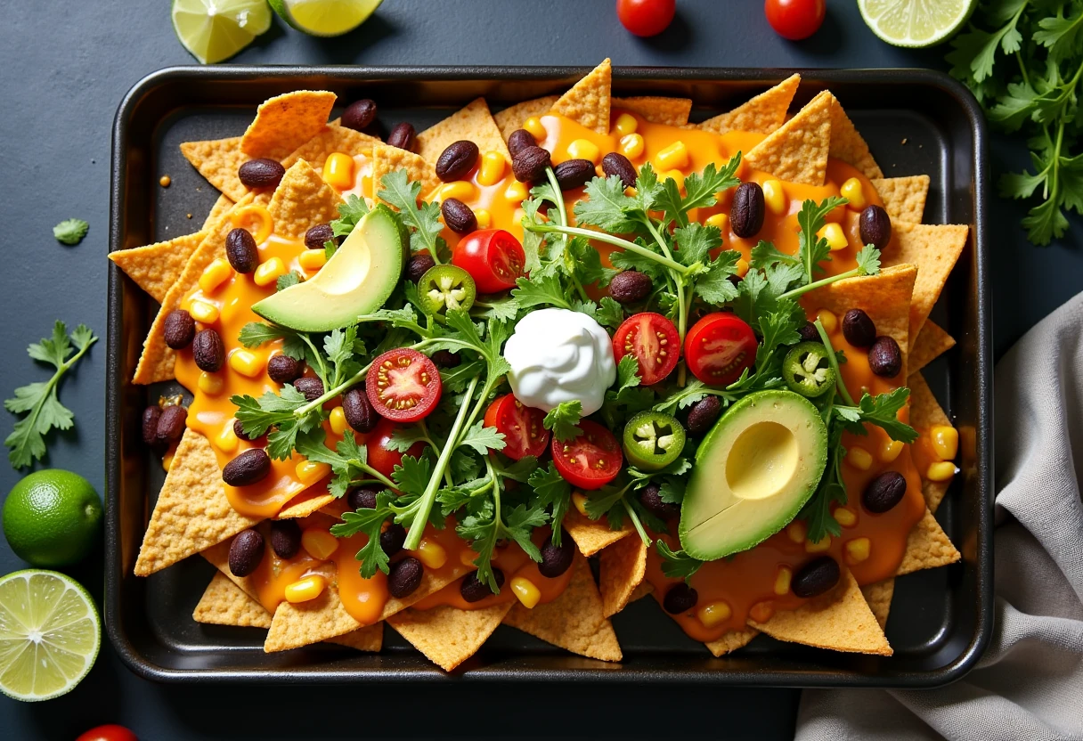 Scatter black beans, corn, and jalapenos evenly over the chips.